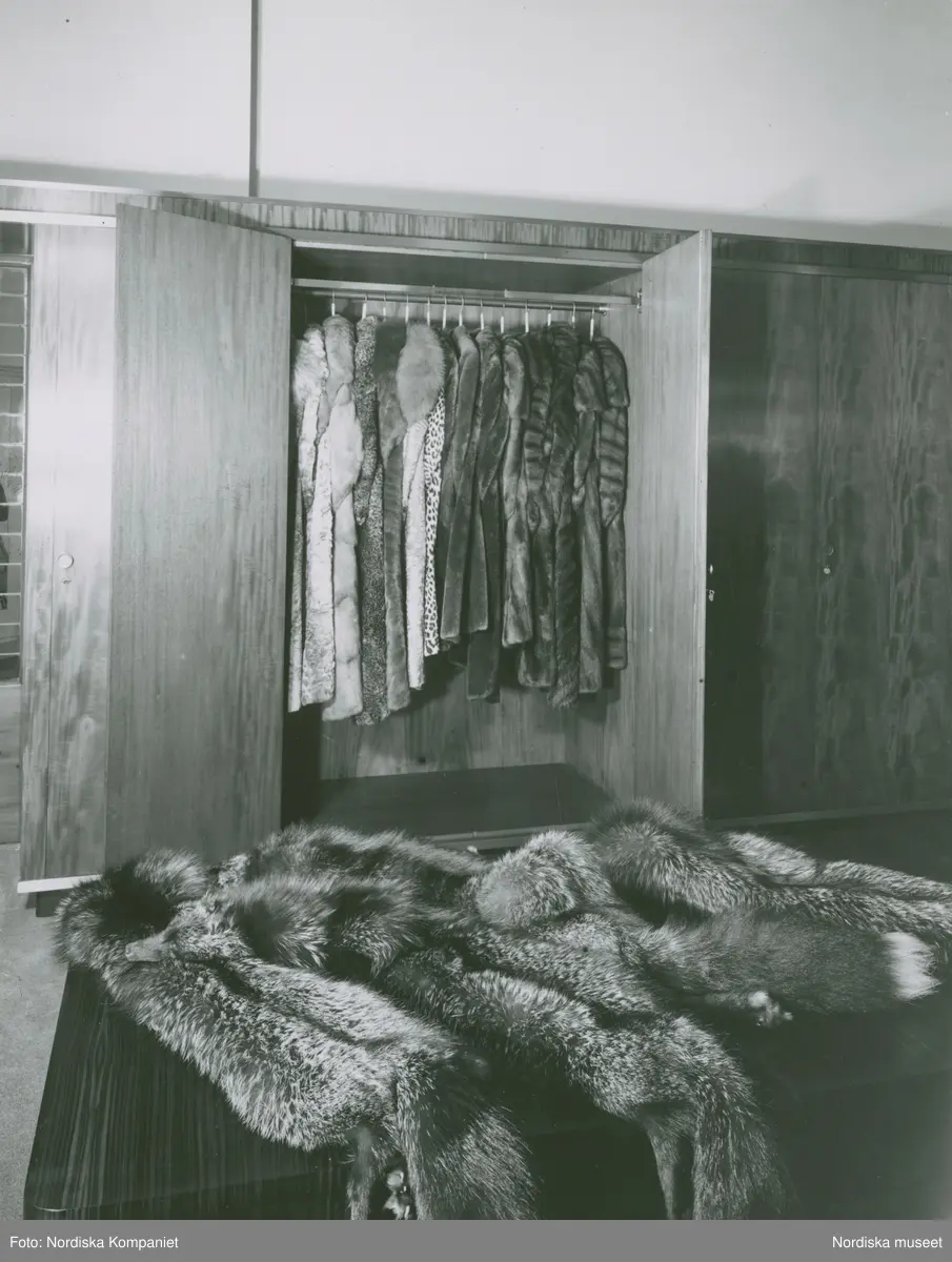 Pälsavdelningen på Nordiska Kompaniet. Pälsar på galgar och bord.