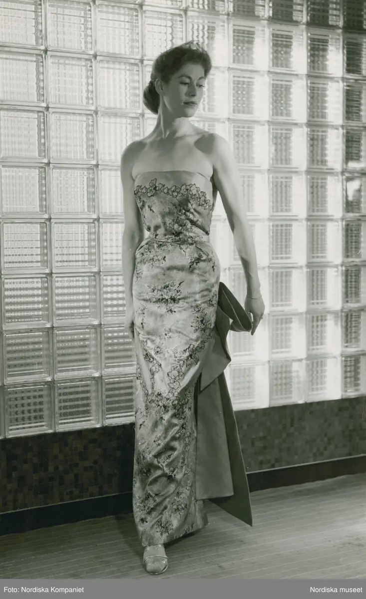 Modell i aftonklänning i blommigt mönster, framför betongglas.