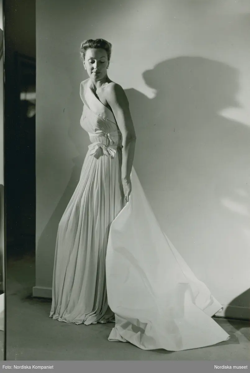 Titel: Modell i aftonklänning med släp och rosetter. NK:s Franska efter Madame Grès.