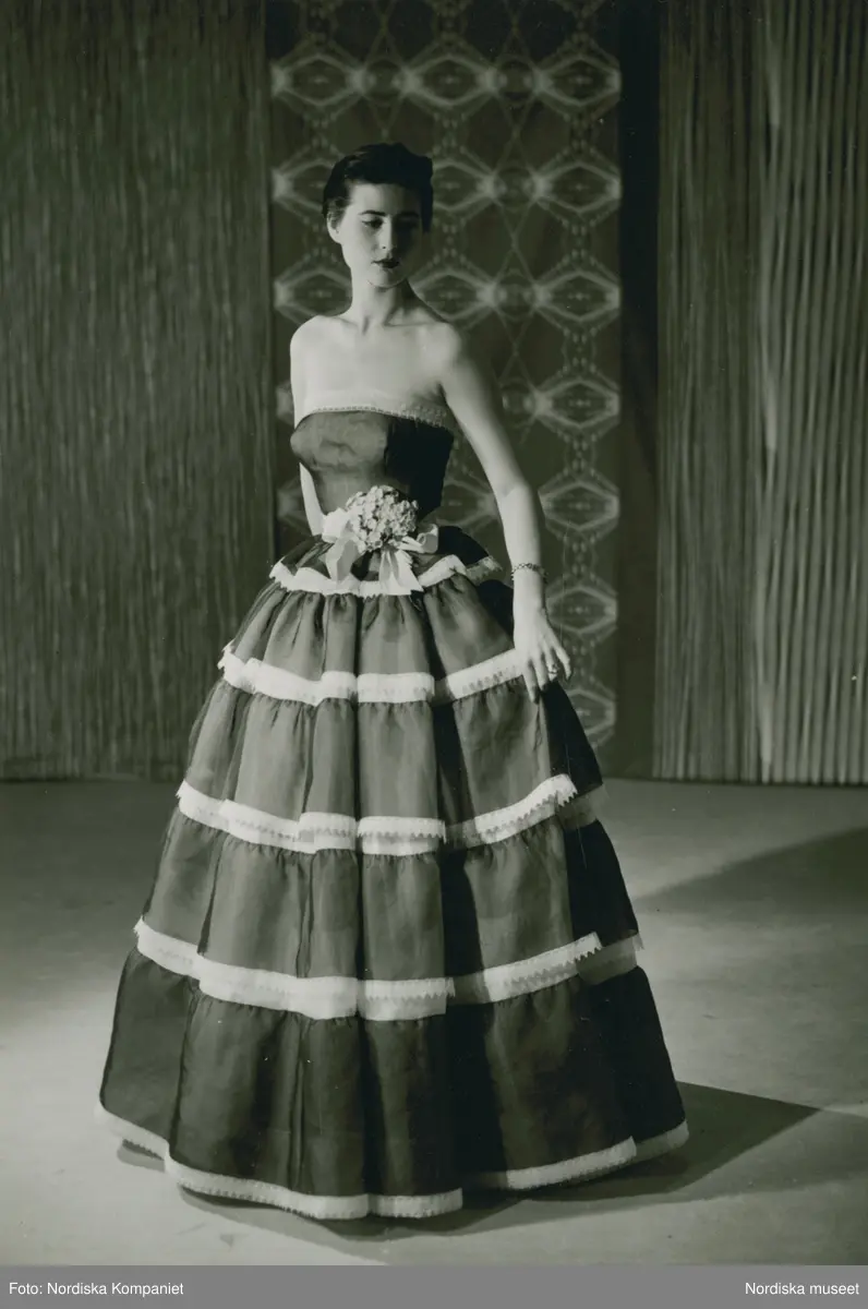 Modell i aftonklänning i etapper med blomstergarnityr. Textilier i bakgrunden.