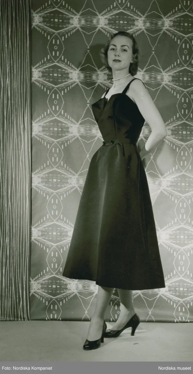 Modell i klänning, pärlhalsband och pumps. Textilier i bakgrunden.