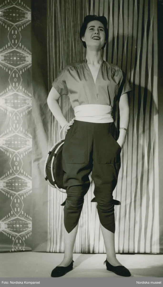 Modell i v-ringad top, midjeband, byxor, platta skor och rund väska. Textilier i bakgrunden.
