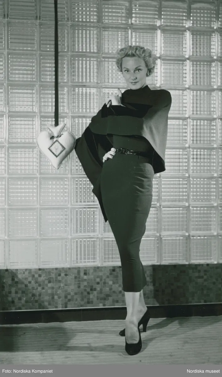 Modell i klänning med sjal, bredvid hjärta framför betongglas.