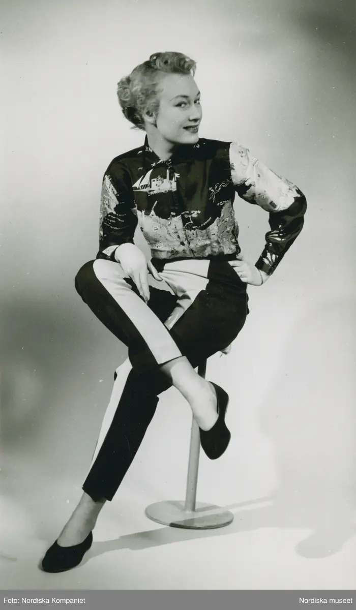 Modell i blus och tvåfärgade byxor, på en pall. "Italiana".