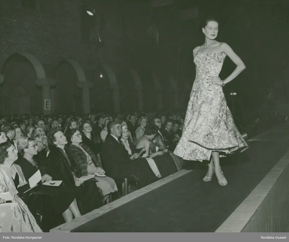 Modegala på Stadshuset, "Italiana". Modell i mönstrad klänning framför publik.