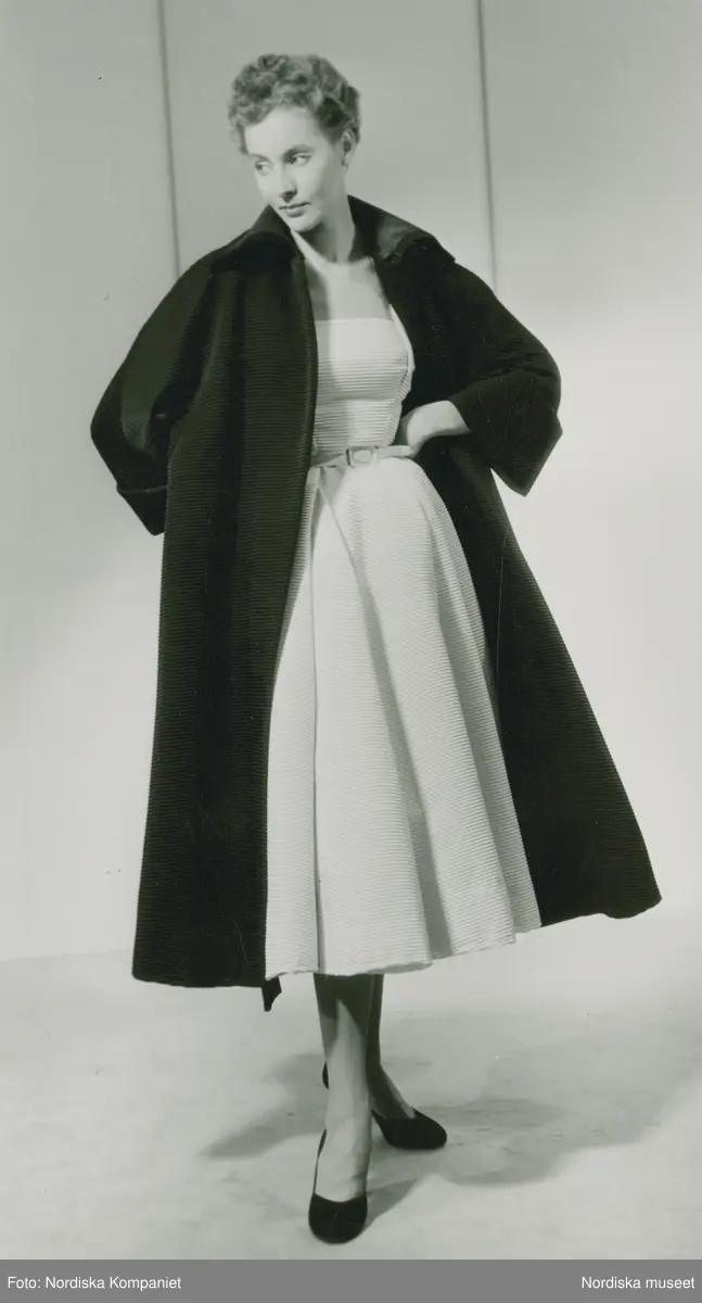 Modell i klänning, kappa och pumps. Från Christian Dior.