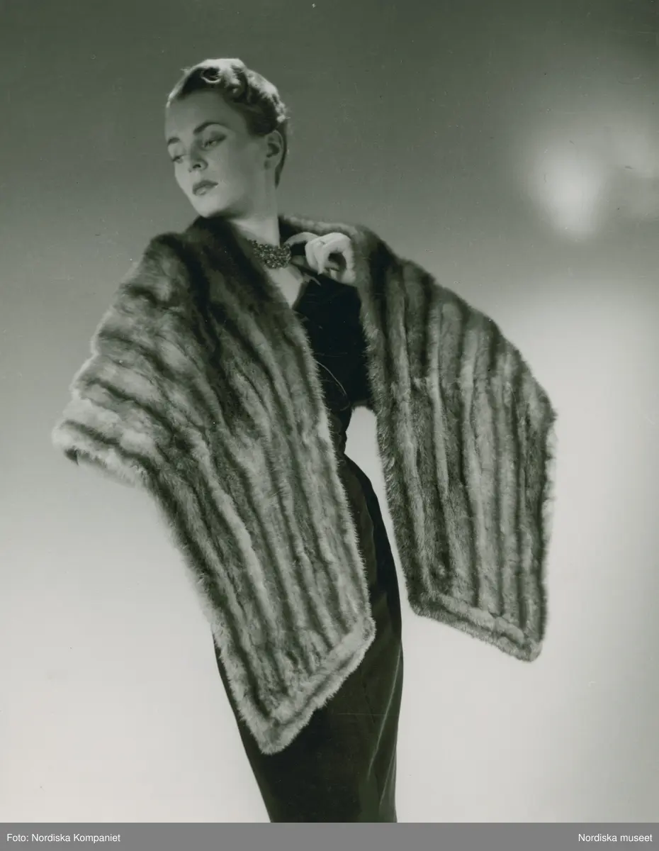 Modell i långklänning, pälssjal och halsband.