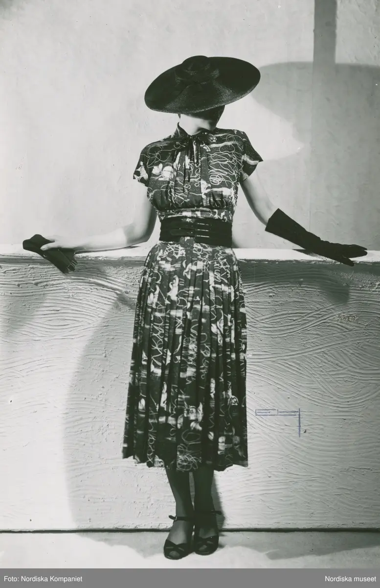 Modell i mönstrad klänning, bredbrättad hatt, handskar och sandaletter.