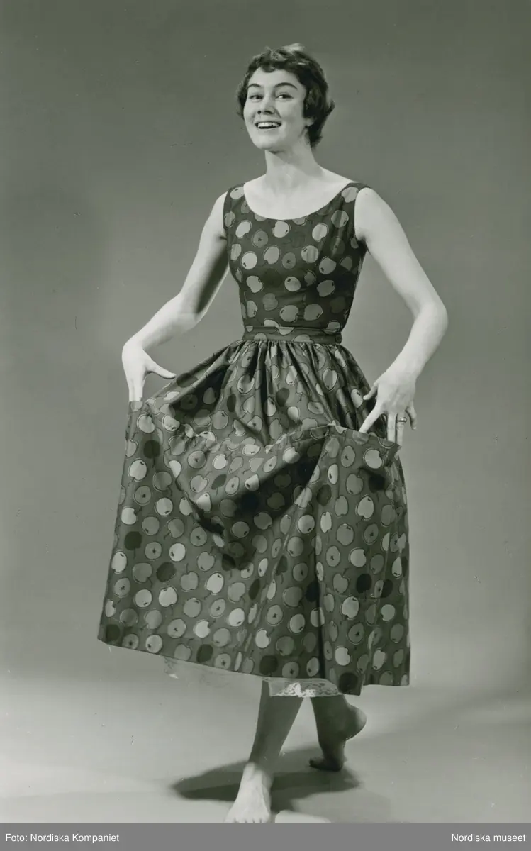 Brud och Hem. Modell i äppelmönstrad klänning.