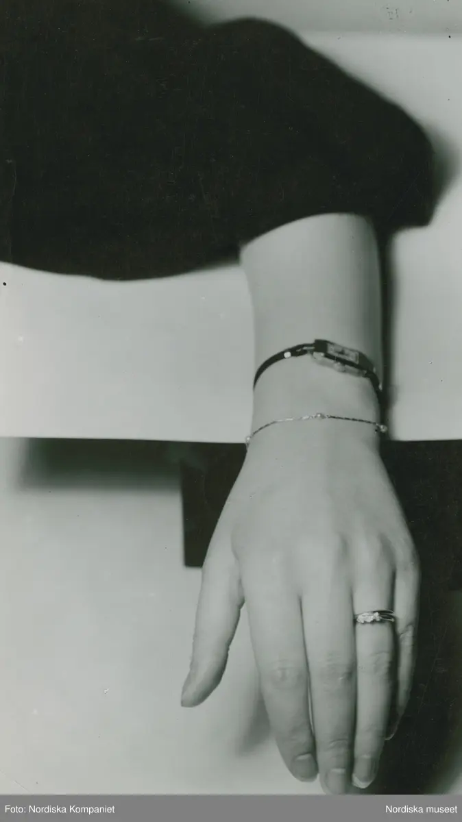 Hand med klocka, armband och ring.
