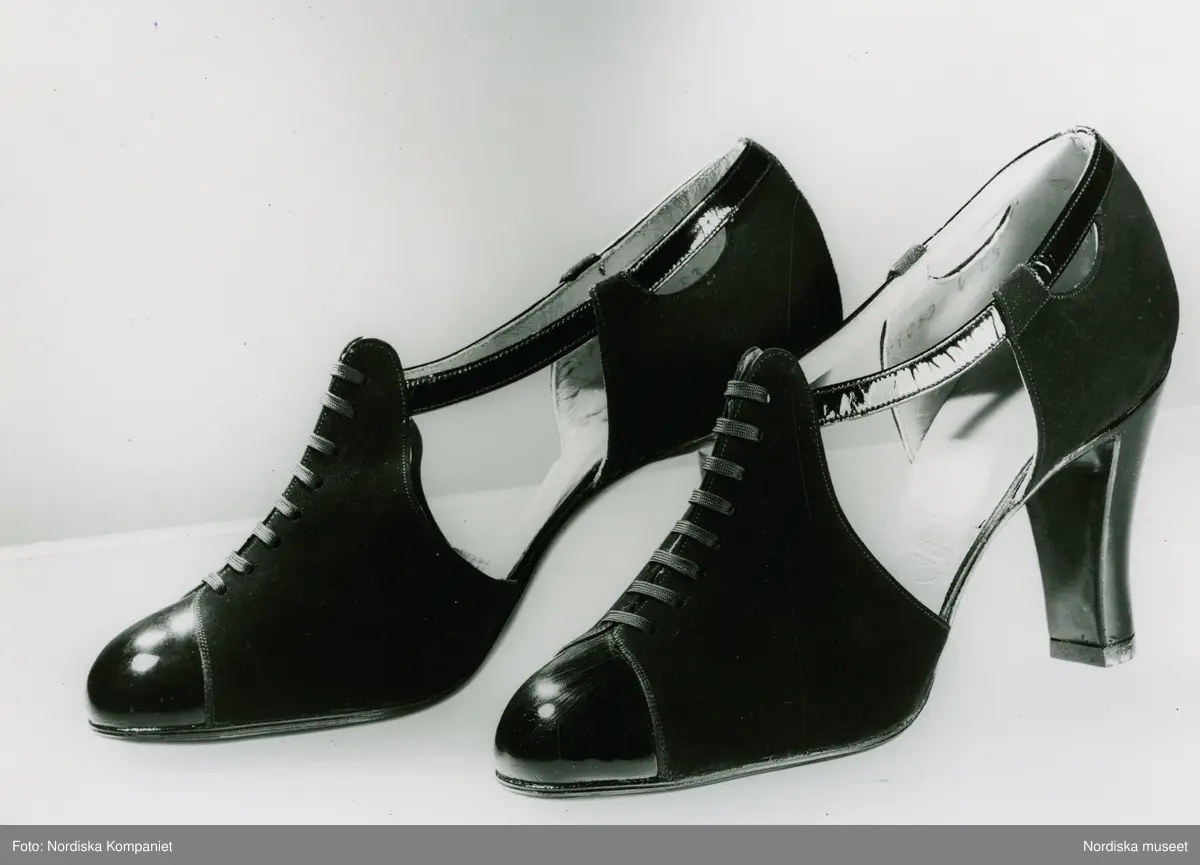 Skor med hög klack, dekorsnörning, skinn och mocka.