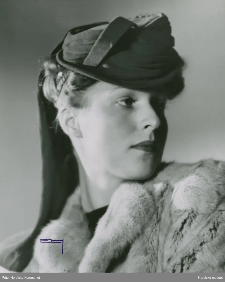 Modell i hatt. Klädd i päls.