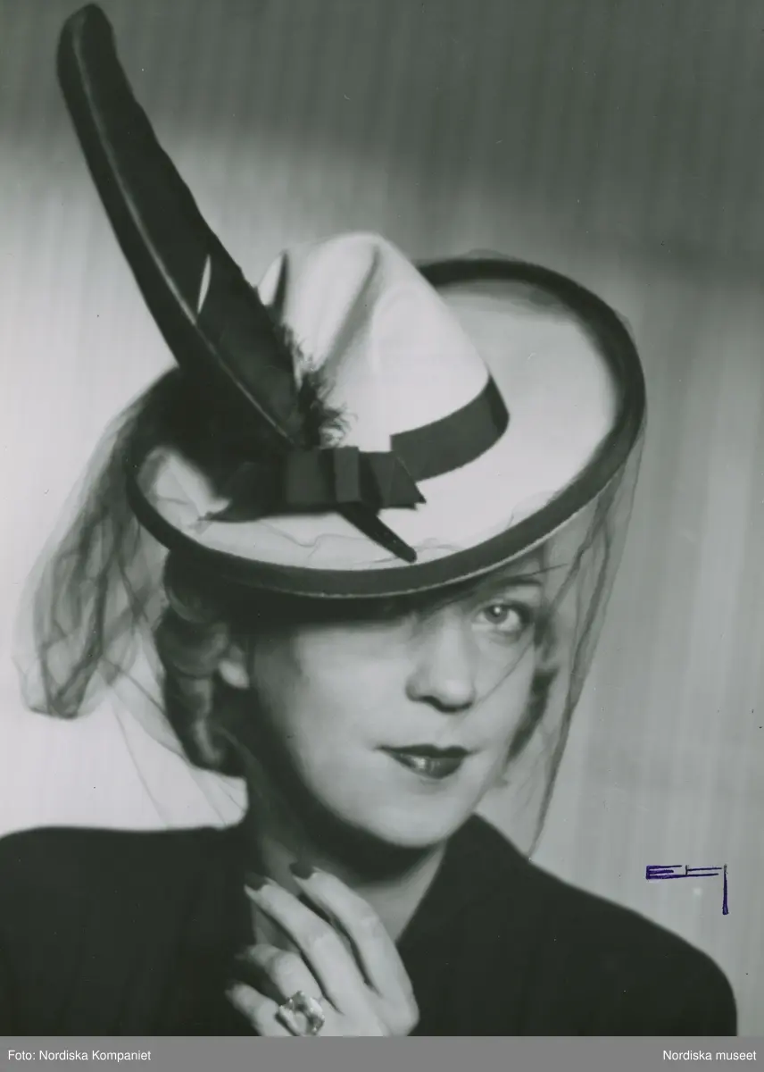 Hatt med kulle och brätte. Hattband, kantband. Fjäder, flor.