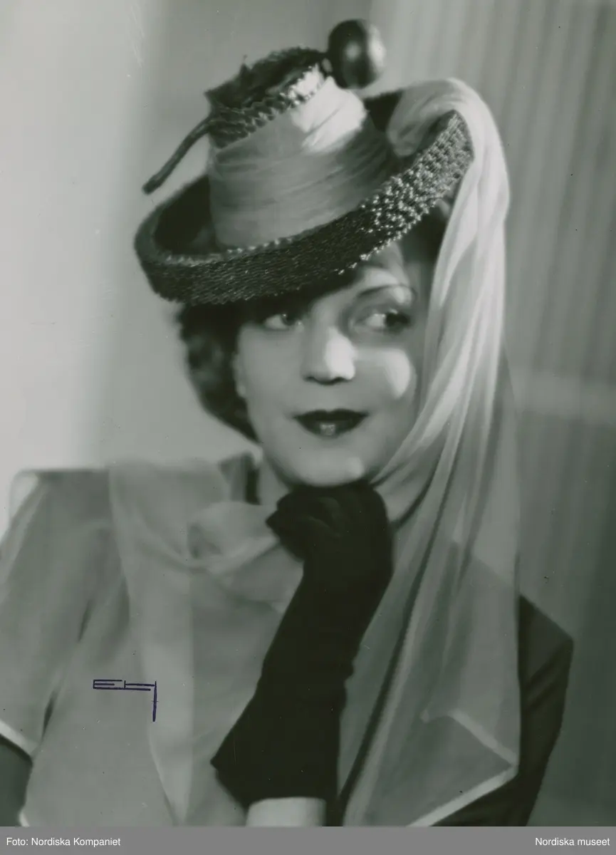 Modell i hatt från Rose Valois med kulle och brätte, sjal knuten runt kullen.