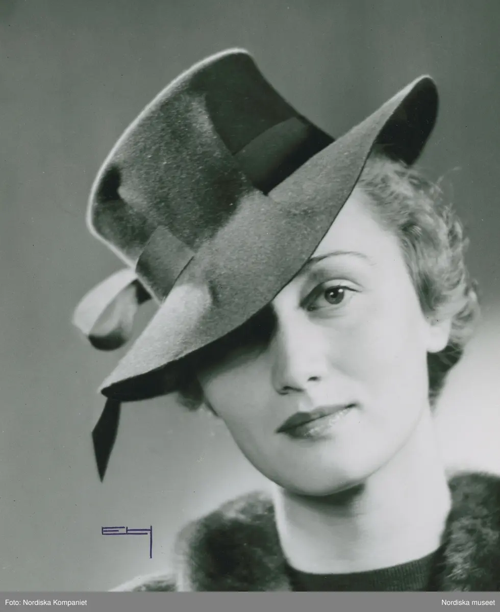 Modell i hatt med kulle och brätte, hattband trätt genom kullen.