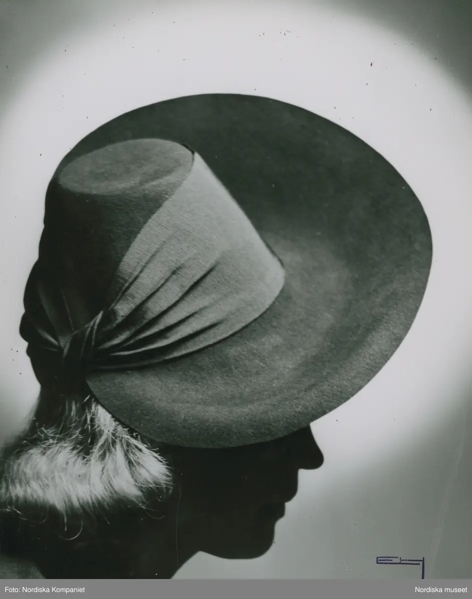 Modell i hatt med kulle, stort brätte, brett hatt band.