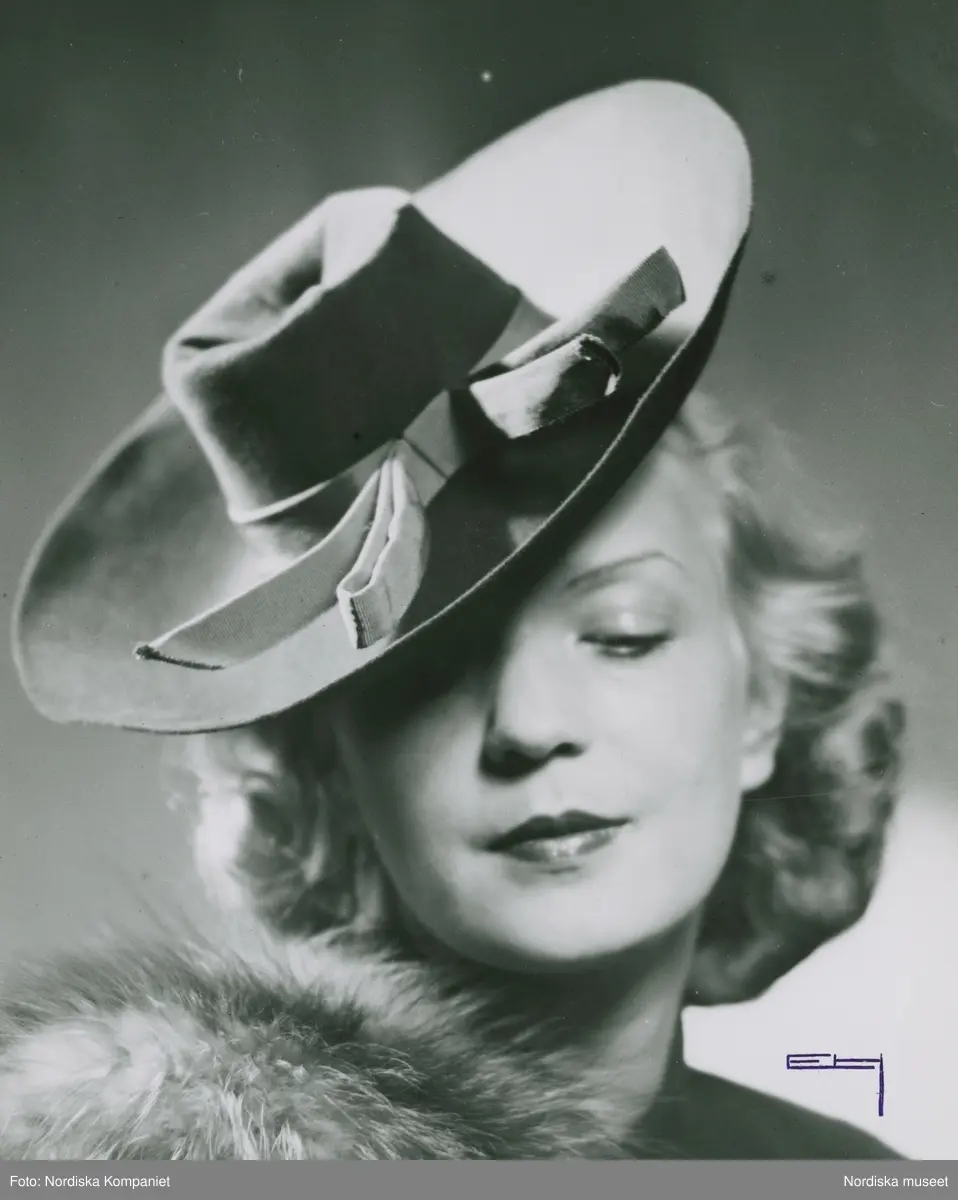 Modell i hatt med kulle och brätte. Hattband med rosett.