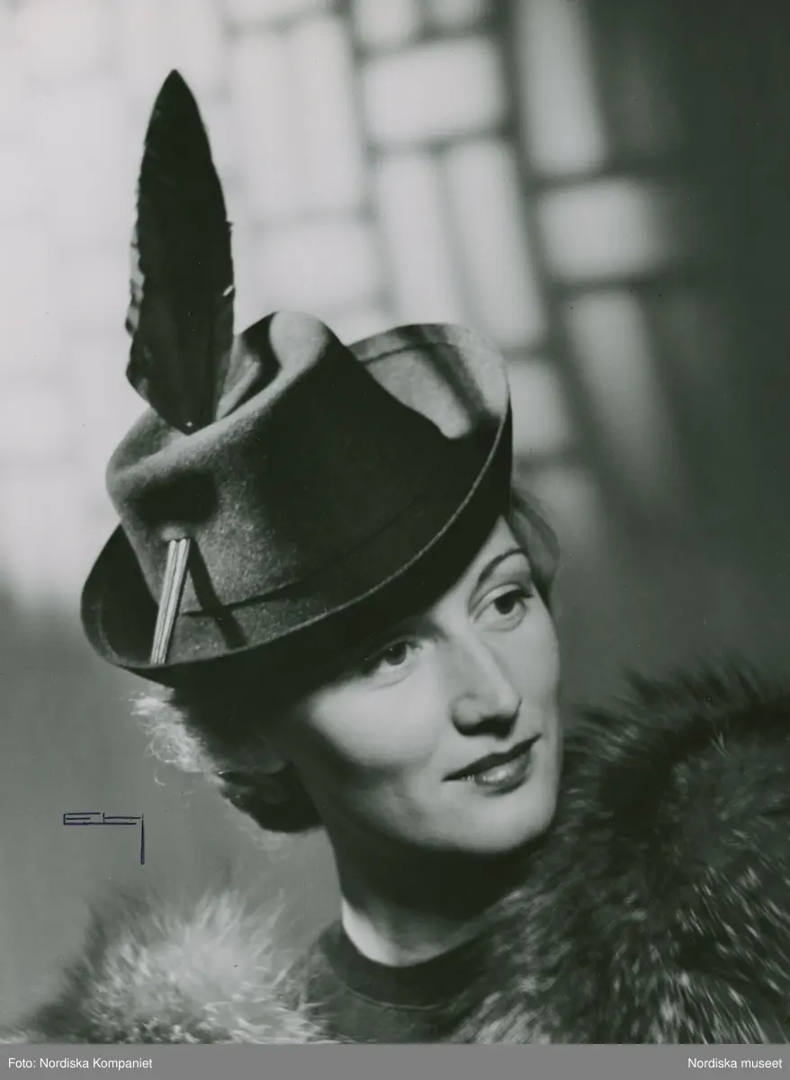 Modell i hatt med kulle och uppvikt brätte. Fjäder.