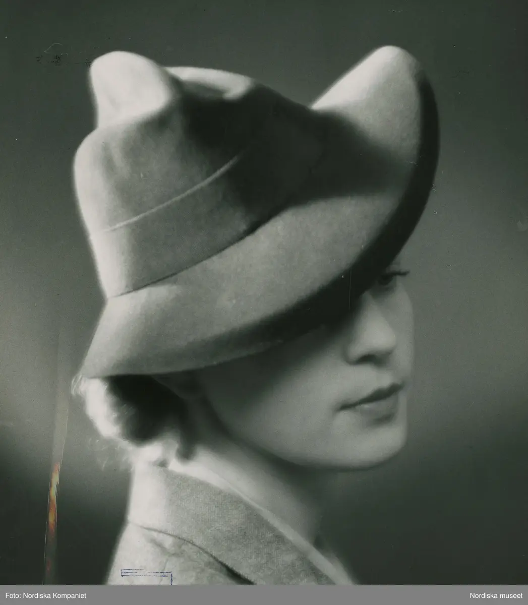 Modell i hatt med kulle och brätte, hattband.