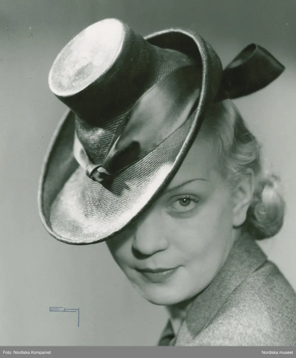 Modell i hatt med liten hög kulle, hattband och svängt brätte.