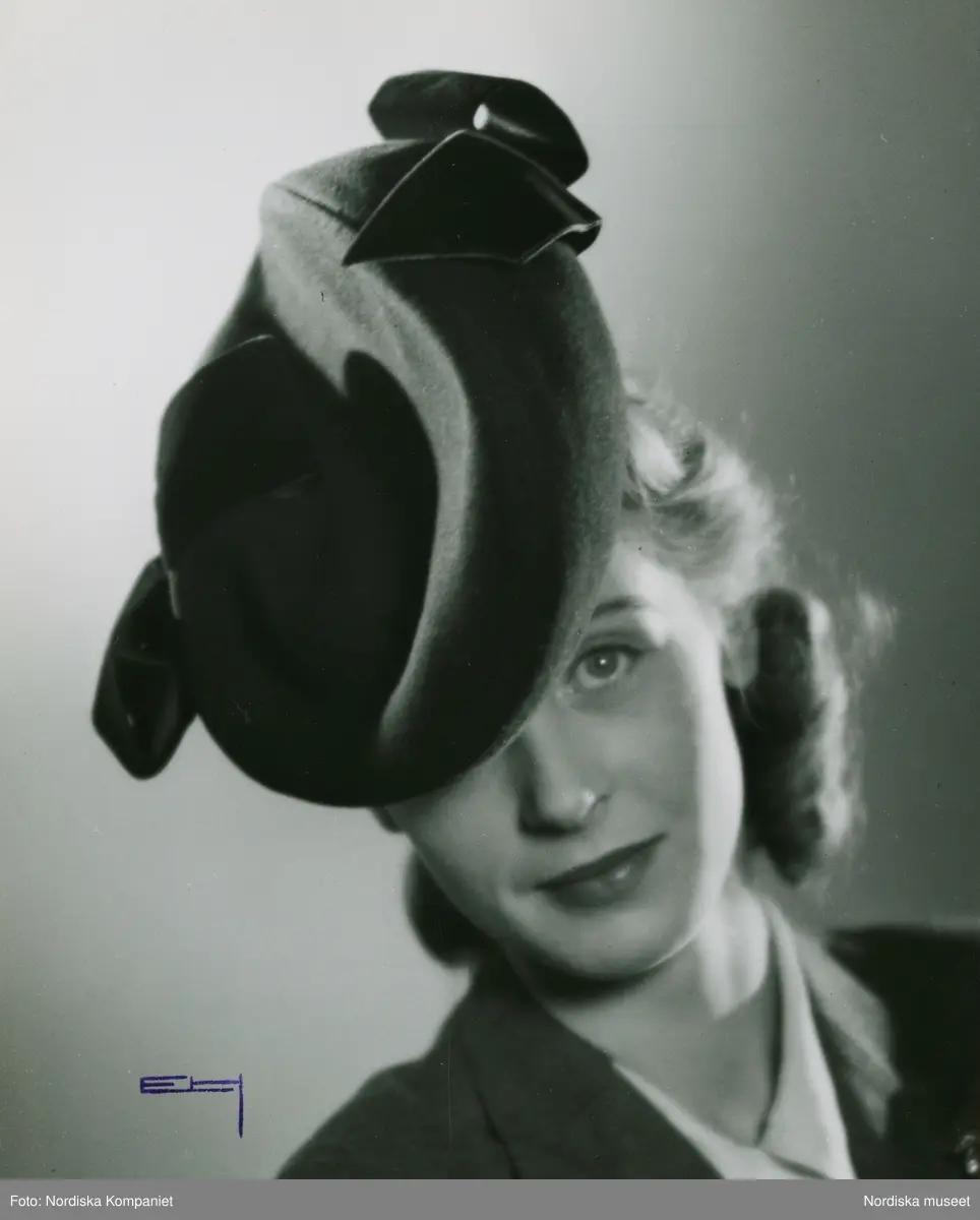 Modell i plat hatt, svängda, mjuka former. Hatten bärs över ena ögat, rosett bak.