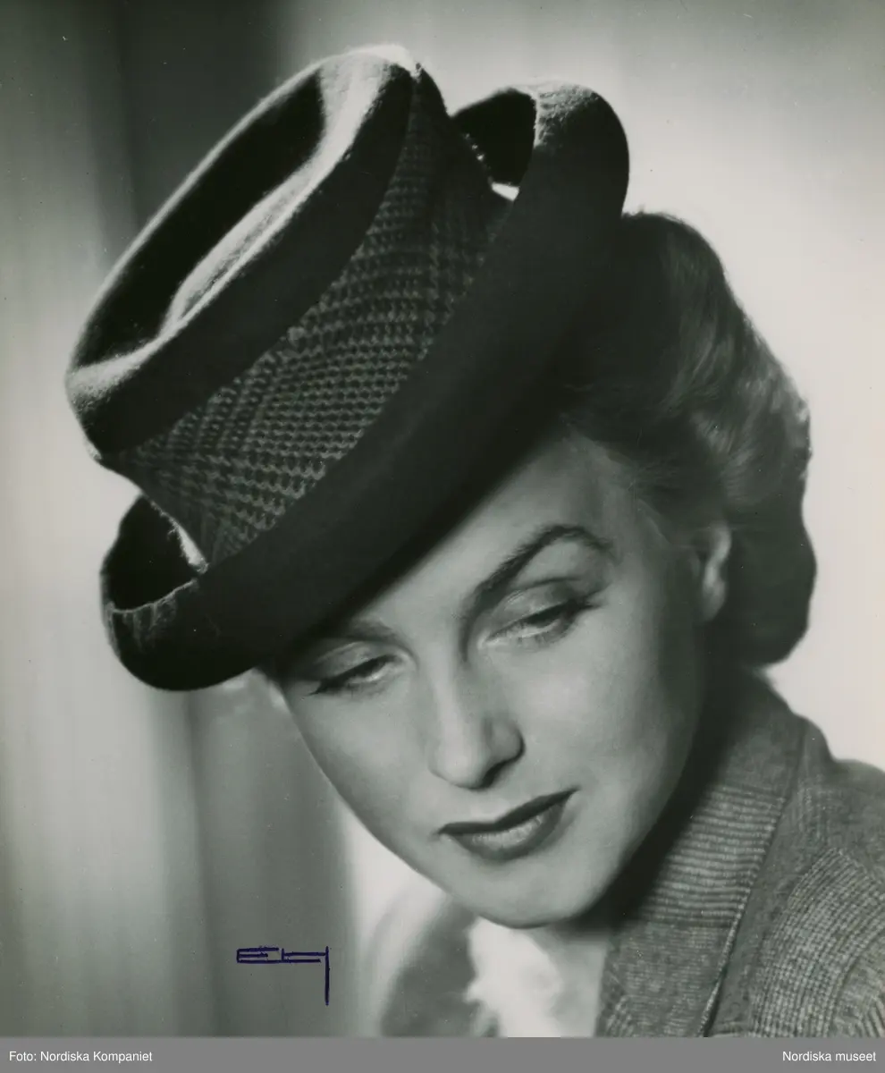 Modell i hatt med låg kulle och brätte med rullad kant, hattband.