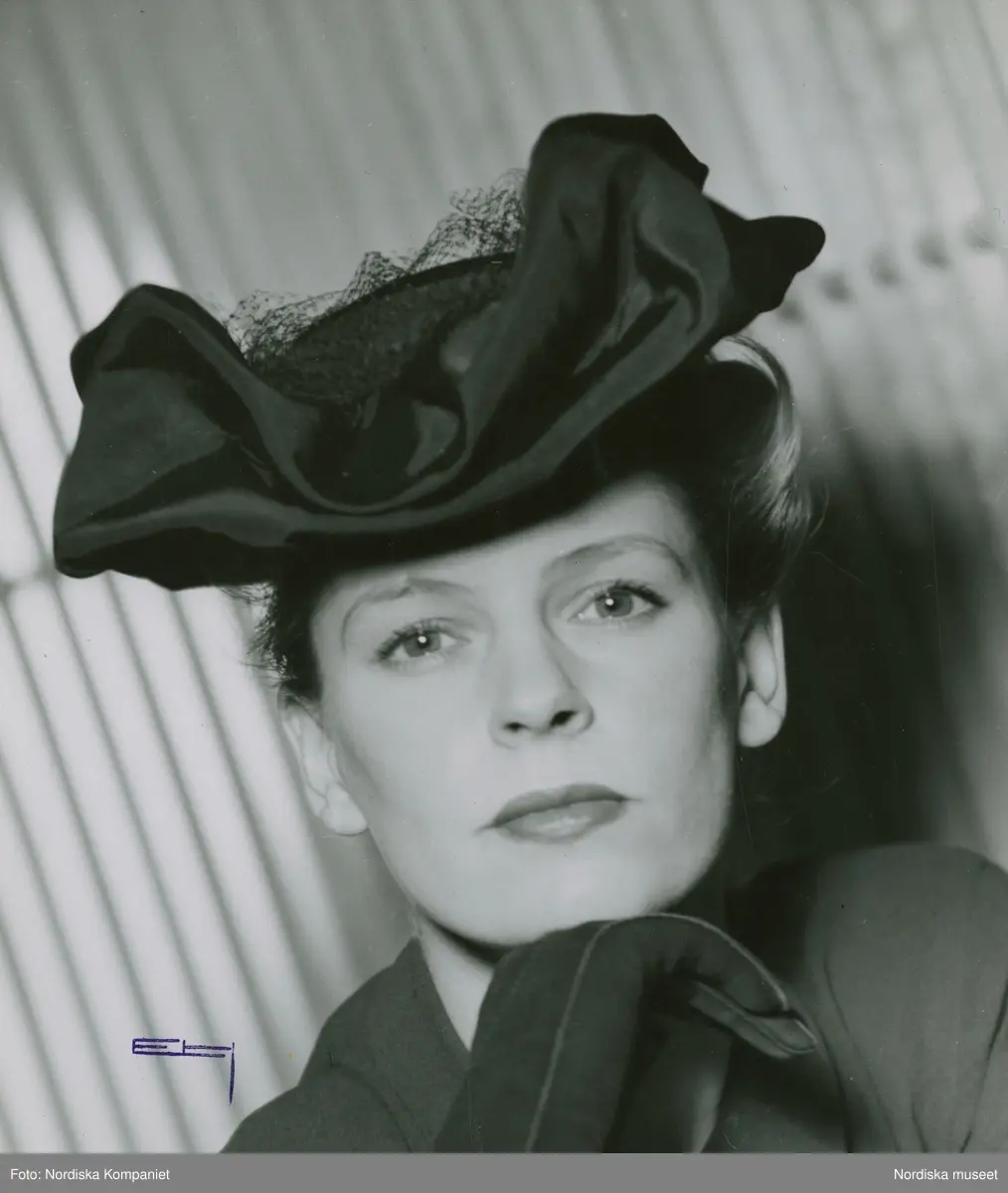 Modell i hatt. Låg kulle täckt med flor, draperat brätte.