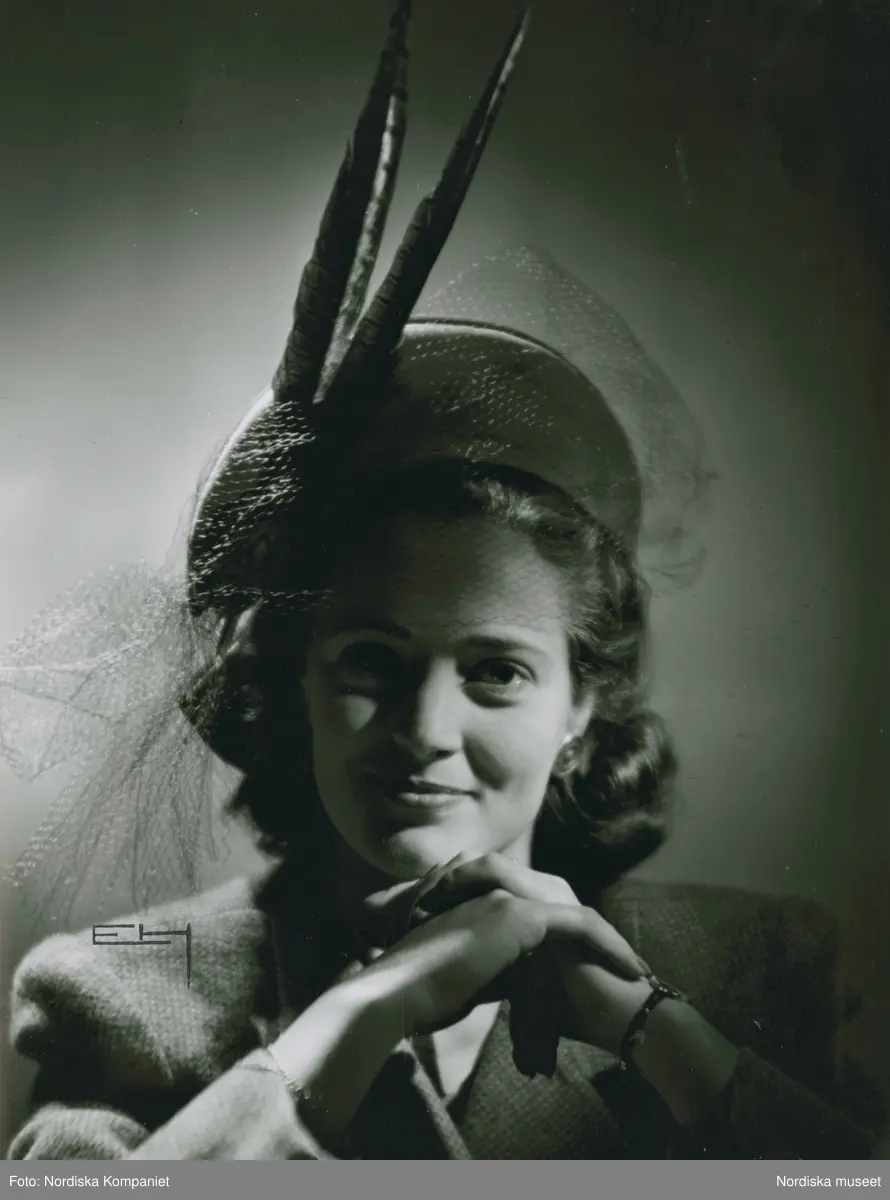 Modell i hatt med rund kulle, fjädrar, flor. Ej brätte.
