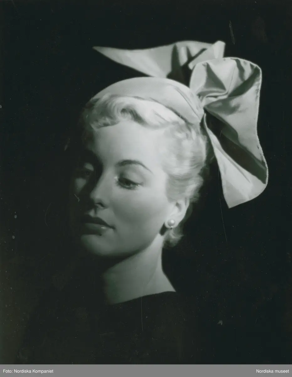 Porträtt av modell i hatt med rosett, pärlörhänge och mouche.