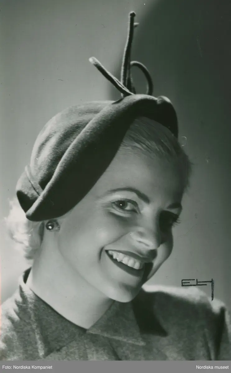 Porträtt av modell i grön velourhatt av Maud Roser, Paris.