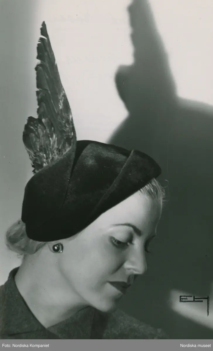 Porträtt av modell i svart velourhatt med svart vinge, samt örhänge. Av Maud Roser.