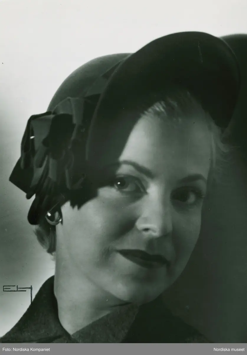 Porträtt av modell i hatt av tobaksbrun antilopfilt med grön bandgarnering.