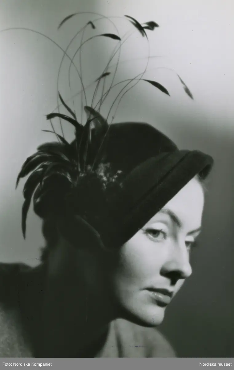 Porträtt av modell i svart velourhatt med fantasi i siden, av Gilbert Orcel.