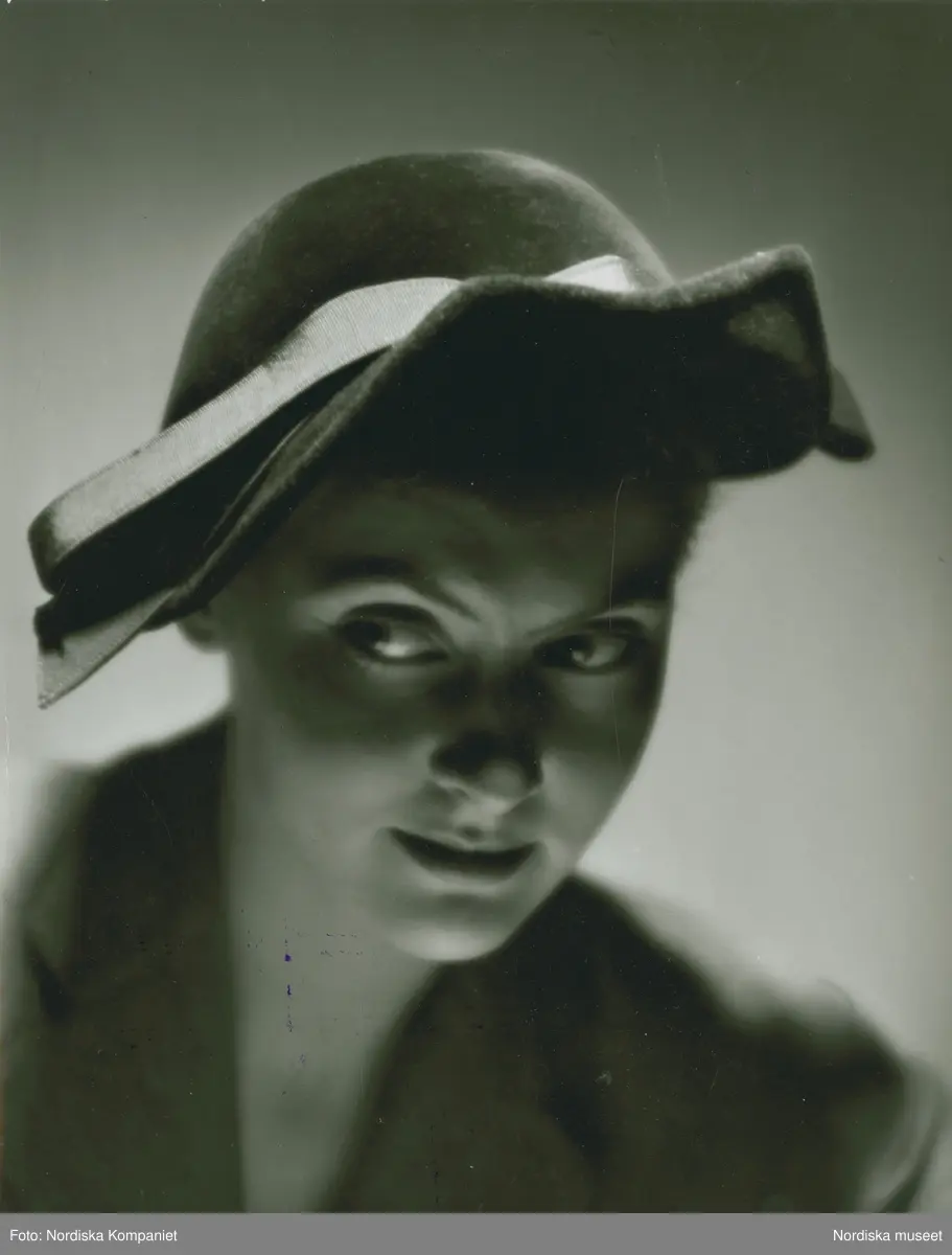 Porträtt av modell i grön velourhatt monterad med rött band.