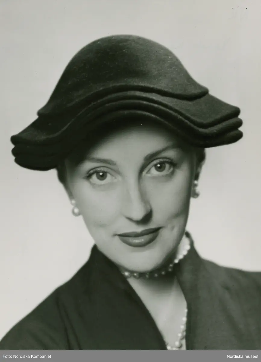 Porträtt av modell i svart hårfiltshatt, pärlörhängen och pärlhalsband.