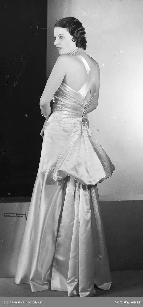 Modell i vit aftonklänning med axelband i kors i ryggen. Från Chanel.