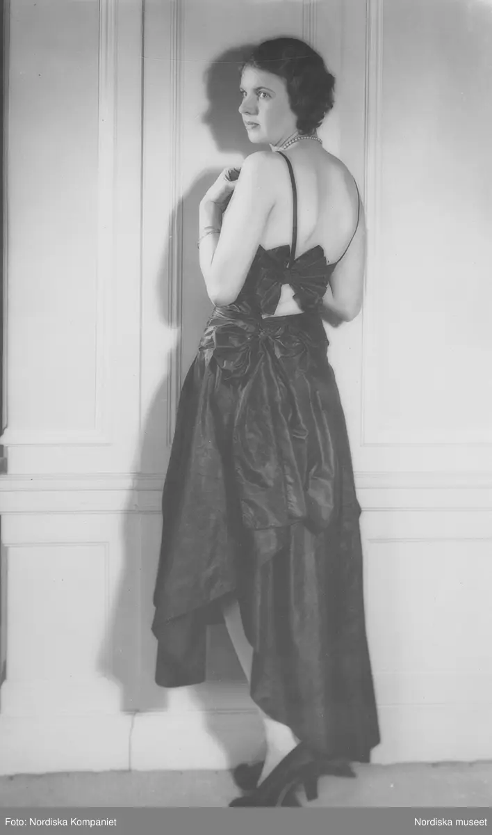 Modell i svart klänning med bar rygg och rosetter baktill, samt pumps.