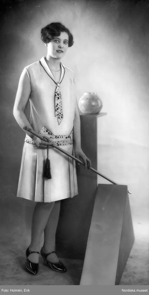 Modell i vit klänning med prickig scarf och band vid höften. Håller i en käpp. Vas på pelare.