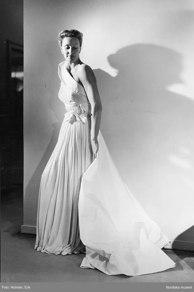 Modell i vit aftonklänning med rosetter och släp. NK efter Madame Grès.