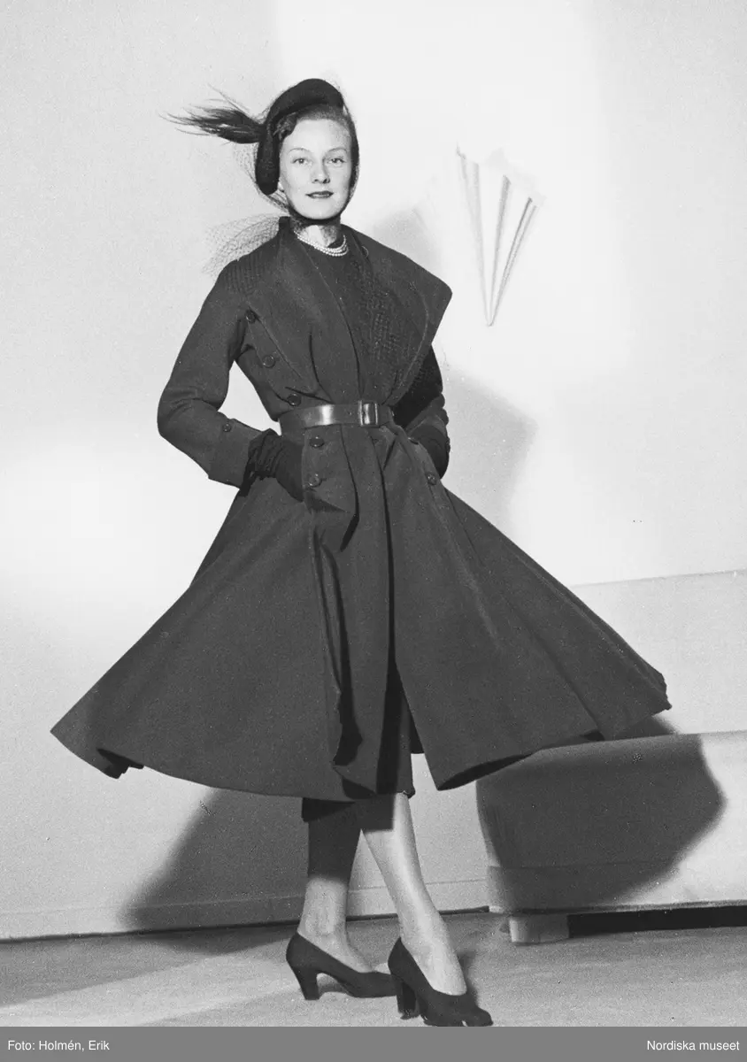 Modell i vid kappa med skärp, hatt med fjädrar och hakband i tyll, handskar och pumps.