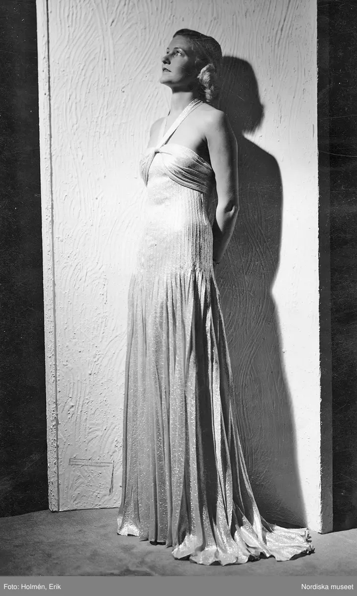 Modell i silverfärgad aftonklänning med litet släp lutar sig mot vit vägg.