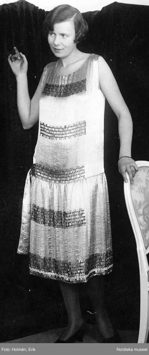 Modell i metallicfärgad klänning med pärlor/paljetter och pumps.