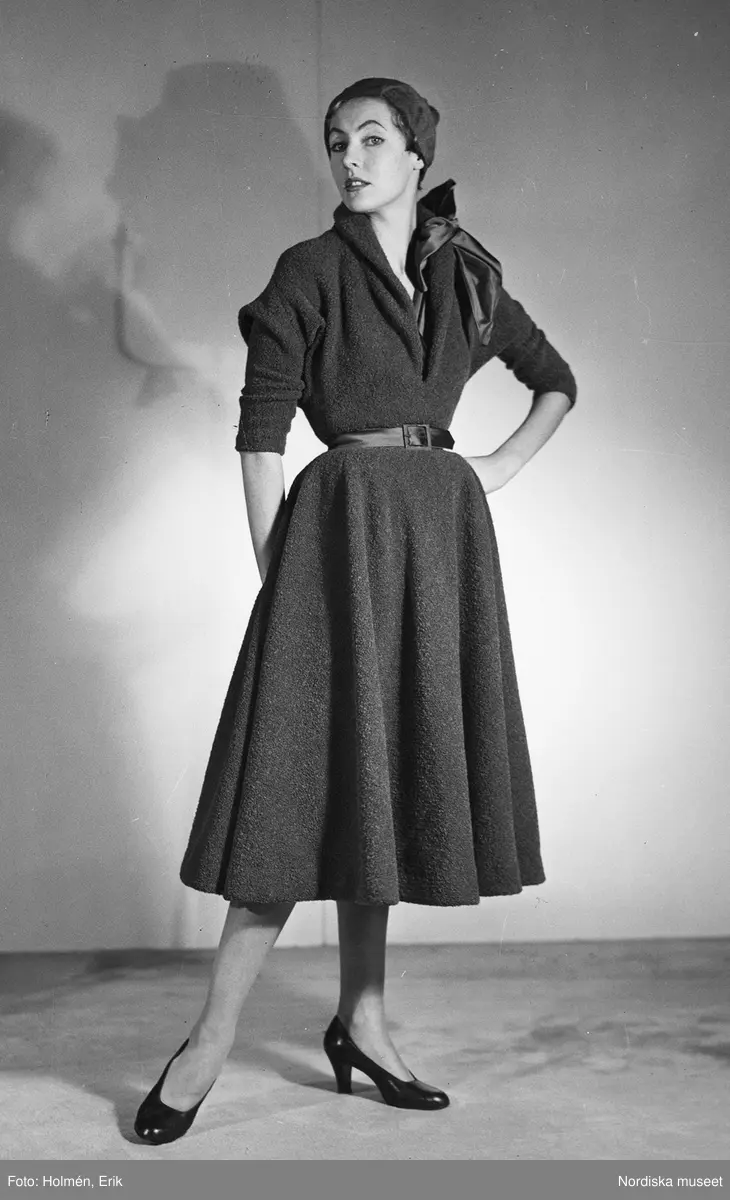 Modell i klänning med sidenrosett och hatt. Av Madame Grès.