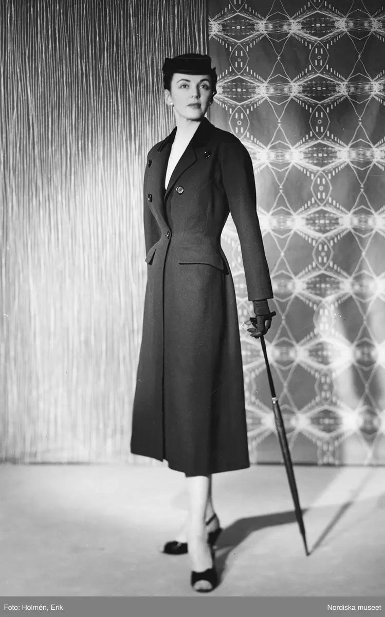 Modell i kappa, hatt och paraply. Från Madeleine de Rauch.
