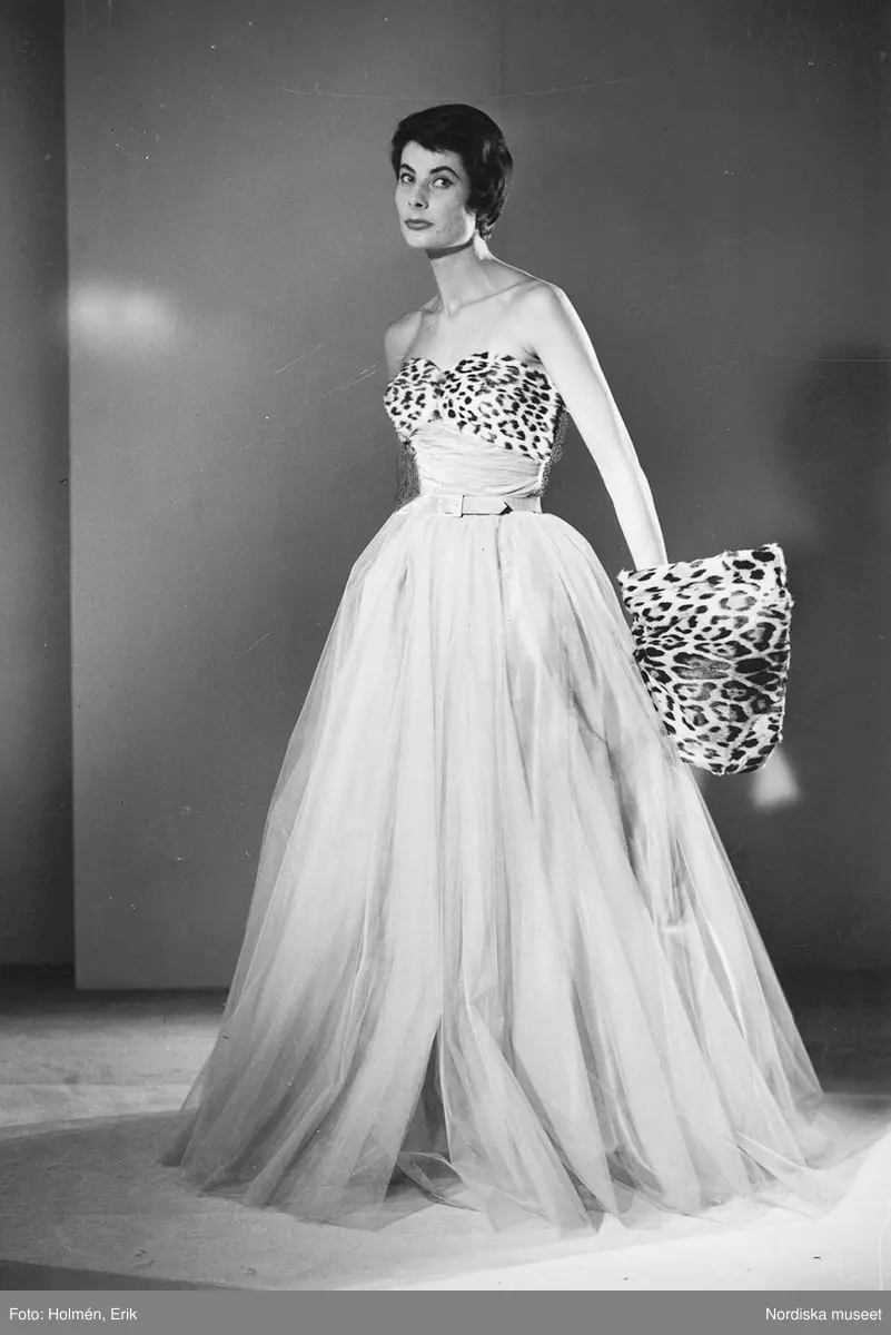 Modell i balklänning med leoparddetalj och leopardmuff.
