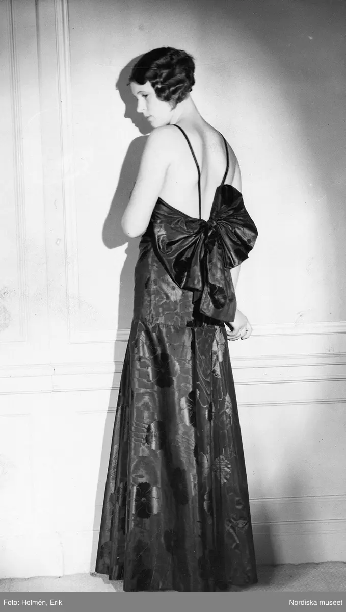 Modell i aftonklänning i svart, blommig moiré med stor rosett i ryggen.