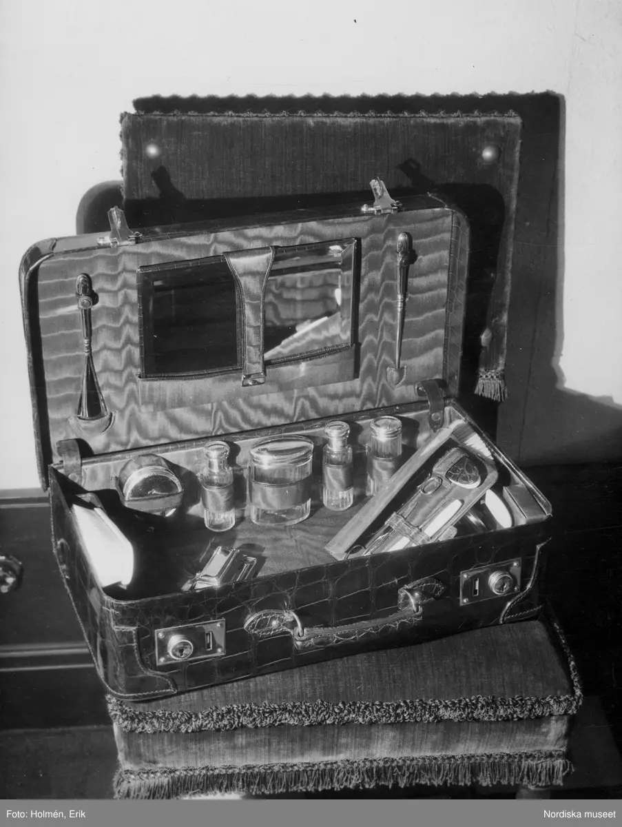 Reseffekter. Portfölj i krokodilskinn innehållande skönhetsvård, på en stol.