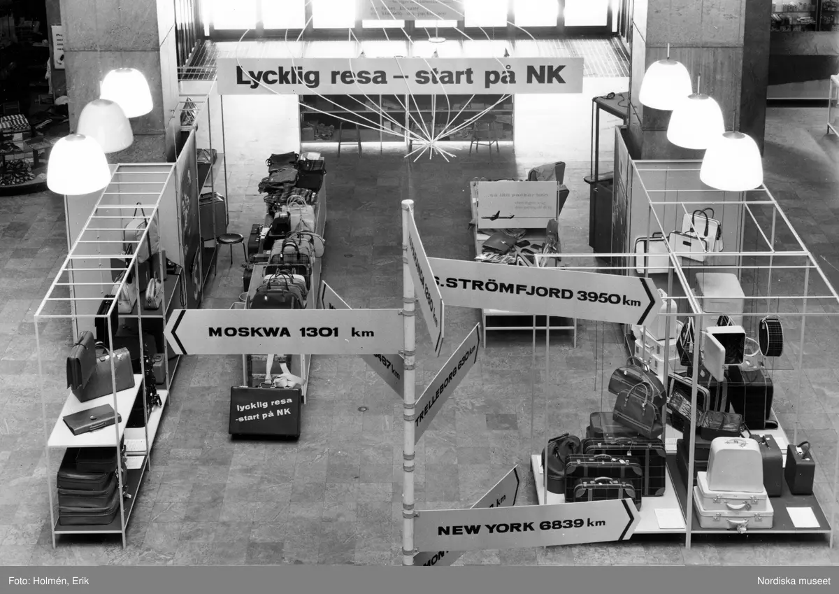 "Lycklig resa - Start på NK." Reseffekter och skyltar på Nordiska Kompaniet.