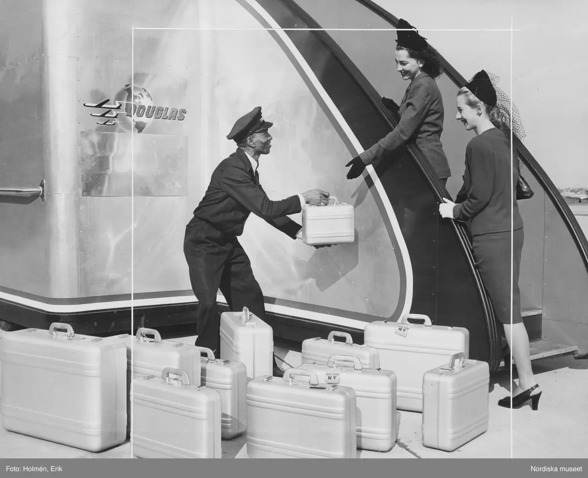 Två kvinnor går in i ett flygplan, man räcker upp en resväska. Douglas Aircraft.