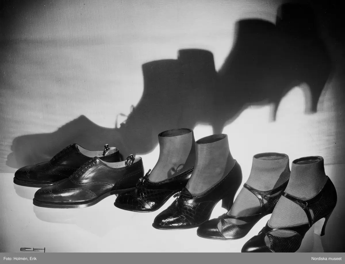 Tre par skor i skinn. Från höger; sandaletter, klackskor i krokodilskinn med snörning och skor i Oxfordmodell.